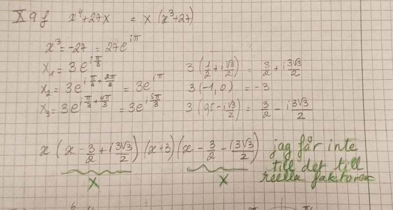 Smaragdalena skrev :Det du vill göra motsvarar att lösa fjärdegradsekvationen . Du ser säkert genast att x = 0 är en lösning till ekvationen, och nästan lika snabbt att x = -3 är en annan. Sedan skulle jag göra en polynomdivision för att få fram andragradsfaktorn. Vad blir ?