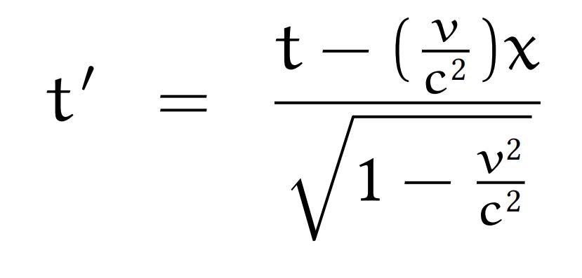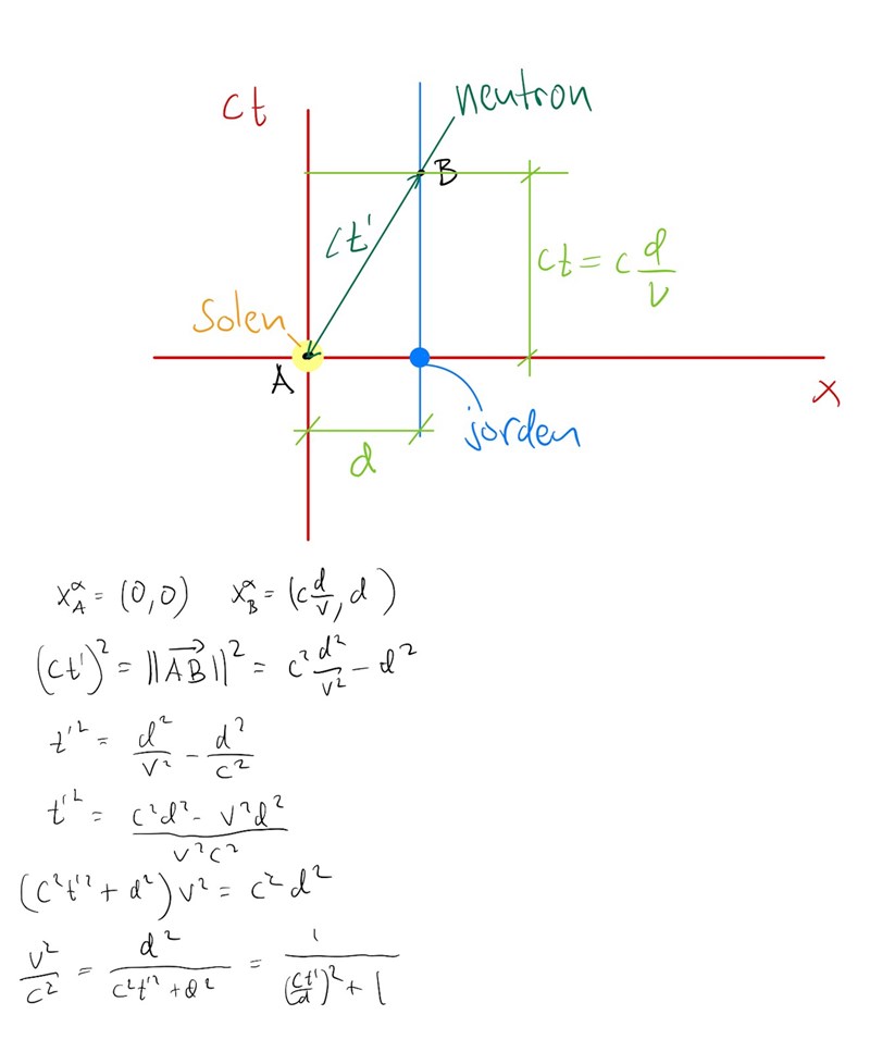 Om tiden för färden är t sett från jorden så är tiden som neutronen uppfattar t’, med sambandet