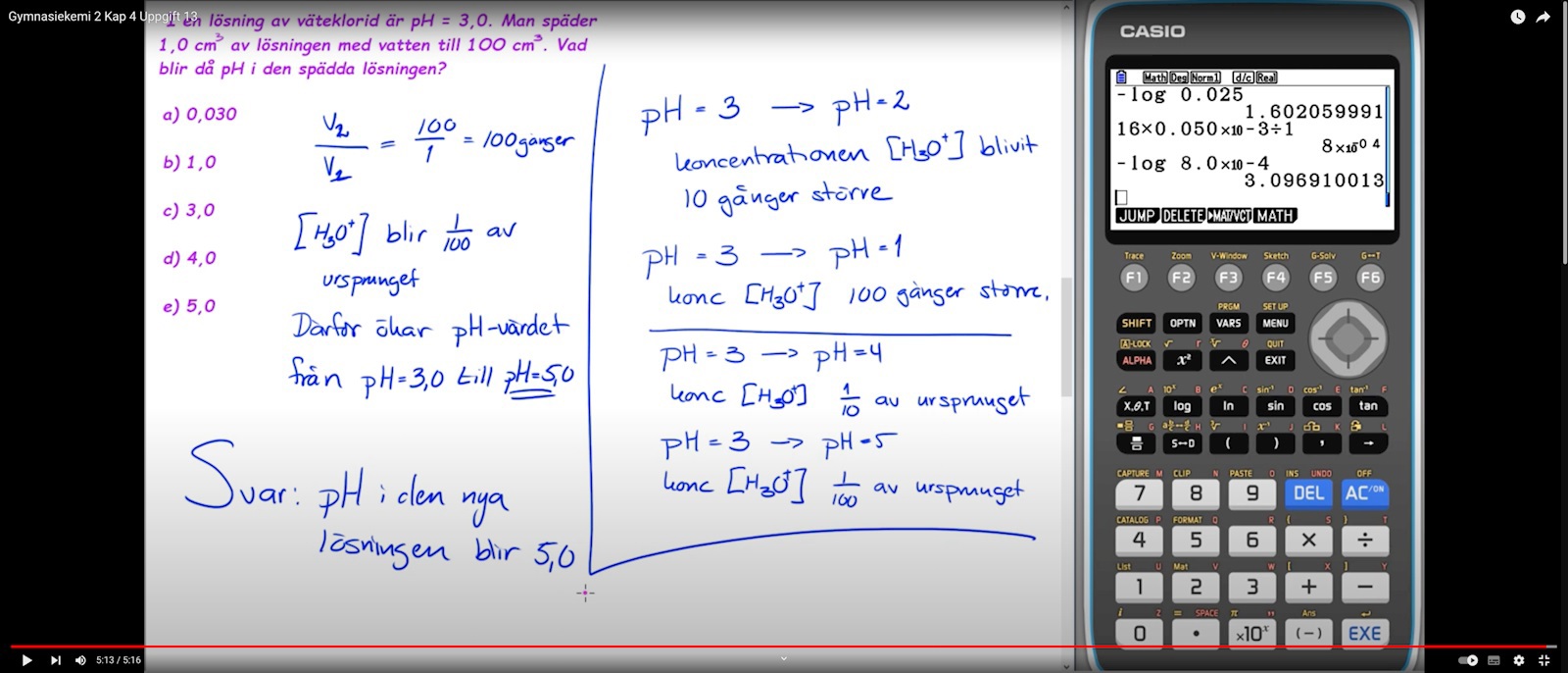 Men det är förfärligt mycket enklare att veta att pH ändras 1 steg när man späder lösningen 10 ggr, så en spädning med en faktor 100 ger en pH-ökning på 2 steg, d v s pH i den utsädda lösningen är 5.
