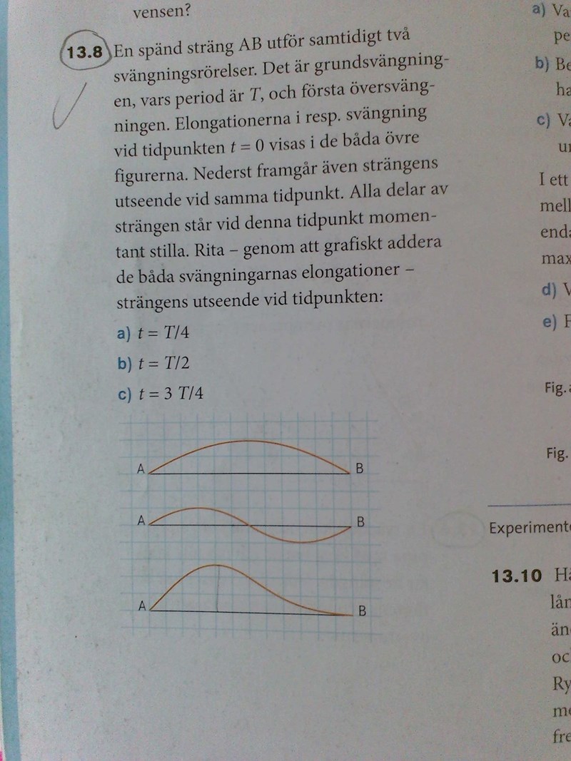 Du ska alltså lista ut utseendet på de två övre figurerna vid de tidpunkter som uppgiften anger, och sedan addera figurerna med varandra så att du får strängens utseende.