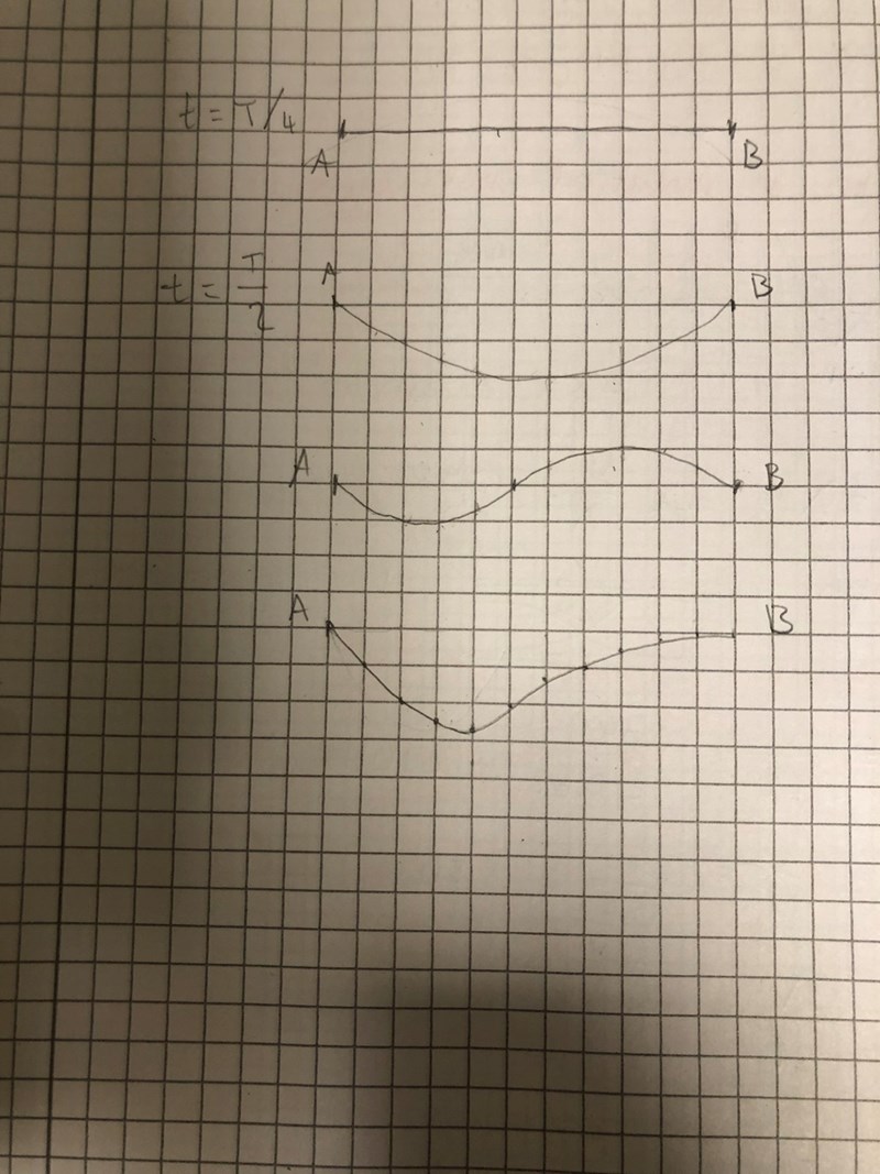 okej, då tänker jag att vid vid T/2 är den första figuren upp och ned vänd och vid T/4 är strängen rak, strängen i den andra figuren är också rak så superpositionen som visas av den nedersta figuren kommer vara 0 och strängen i sista figuren blir också rak. Tänker jag rätt nu?