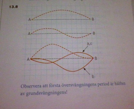 Figuren längst upp är superpositionen av grundtonen och första övertonen (kan man formulera sig på detta vis?). Sedan kommer grundtonen vid en halv period följt av första översvängningen vid en halv period och sedan deras superposition.