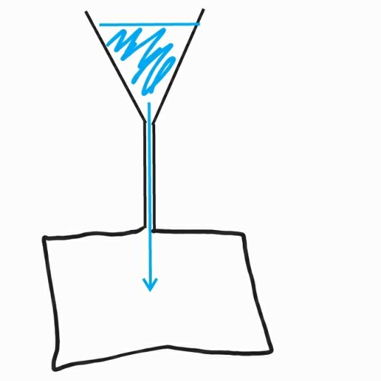 Likställ detta med till exempel vatten. Föreställ er en stor konformad tratt fylld med vatten upp till kanten. Ner från tratten går ett smalt rör. Röret är "trångt" och ska symbolisera en resistor.