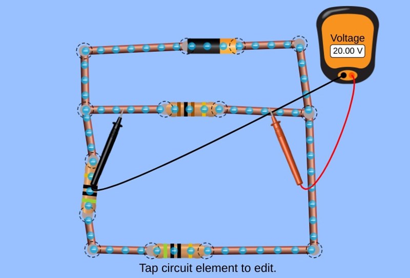 Varför/hur är spänningen 20 V? Elektronerna passerar resistorn? Däremot om vi mäter spänningen över 50 ohm resistorn då är det 10 V. Varför ändras det inte för 20V?