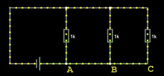 Det som skiljer är kablar med "noll" resistans, så det finns ingen resistans mellan A, B och C. Det finns ingen spänningsskillnad mellan A, B och C.