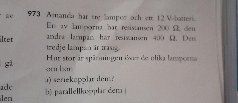 Jag har en fundering kring 973 a. Jag förstår att lamporna bör ha spänning 0, i och med att de bäör seriekopplade. Men i facit står det att den trasiga lampan har spääning 12 v. Hur kommer det sig? Är det så att spänningen "fastnar där" och inte kan komma förbi, vilket är därför de andra lamporna ej får spänning? Eller hur är det egentligen?