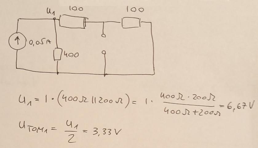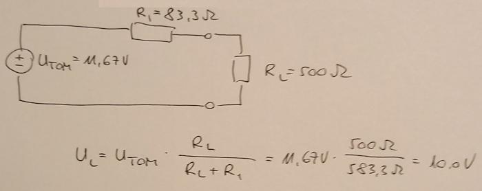 hur ska jag tillämpa tvåpolssatsen för att beräkna späninngen över 500ohms resistorn? Har försökt med tvåpolsomvandling men får ej rätt svar som är 10,0v
