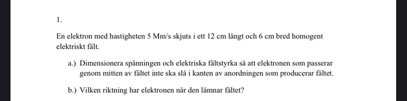 Din uppgift är att "dimensionera fältet". Förmodligen tänker sig uppgiftsmakaren att du ska dimensionera ett mot elektronens infallshastighet vinkelrätt fält så att styrkan är maximal samtidigt som elektronen precis klarar sig igenom anordningen utan att slå i bottenplattan.