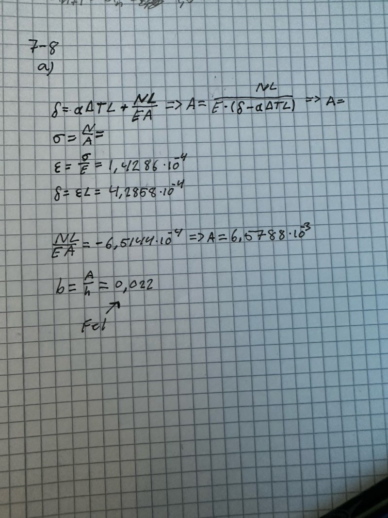 Ja, alltså. Till att börja med ska du kanske fundera på det faktum att du har två olika krafter. Sedan har du även två olika areor. Du har räknat som om det bara finns en stång med konstant area och endast en kraft.