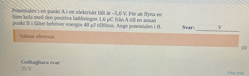 Hej jag förstår inte riktigt varför svaret inte är -35V, jag har räknat ut att spänningen bör vara 30V. Sedan tänkte jag att en partikel alltid går till lägre potential och då borde väl svaret bli -35 och inte 25V (för då går man ju mot högre potential ? )