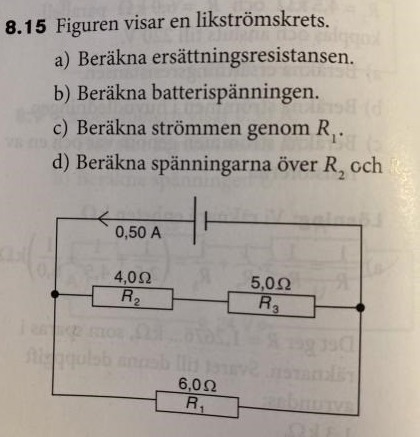 Då har vi en ström på 0,5 A som delar sig i en gren som har motståndet 9 ohm och en gren som har motståndet 6 ohm. Strömmen fördelar sig efter motstånd så att den gren med minst motstånd får den högsta strömmen proportioneligt i förhållande till motståndet. Om du kallar spänningen från batteriet U så blir strömmen i den övre grenen U/9 och i den undre grenen U/6 och de båda strömmarna blir tillsammans 0,5 A som också är U/ersättningsmotstådet för hela kretsen (=3,6 ohm) och vi kan sammanfatta det med
