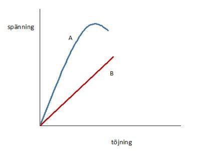 Jag vet att material A har högre UTS än B. Däremot har jag svårt att urskilja var sträckgränsen till material A är, som jag vill använda för att avgöra om materialet har högre eller lägre elastisk deformation än B. Därför försöker jag istället ta reda på om A är mer/mindre styvt än B. Enligt E-modulen, bör A ha högre styvhet än B? Genom uteslutningsmetoden får jag då fram att svarsalternativ 2 är rätt. Stämmer det?