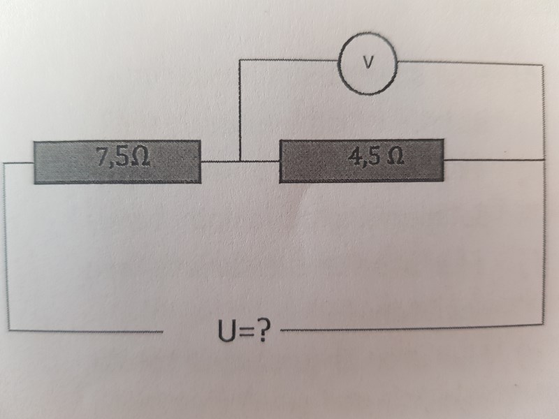 Så då blir det först I = U/R ---> 7,2/ 4,5 som blir 1,6 A. Spänningen över 7,50 ohms resistansen måste då bli U = R*I ---> 7,5 * 1,6 = som är 12. Är det 12 + 7,2 sen eller? 19,2 V