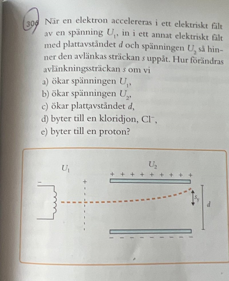 Svaret på e) från facit är: En proton kan inte accelereras av spänningen U1.Den kan aldrig komma in i det vertikala fältet.