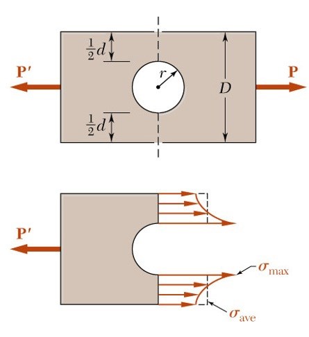 Exempelvis har du att om radien hos hålet är mycket liten jämfört med bredden på stången kommer faktorn gå mot värdet 3 vilket alltså är en tredubblad ökning av spänningen vid hålet: