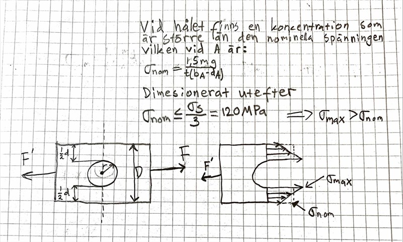 MIN FRÅGA: Jag skall nu beräkna spänningen för stångens svagaste del. Jag har kommit fram till att det är hålet. Hur gör jag? Vore tacksam över en bild av hur det ser ut.