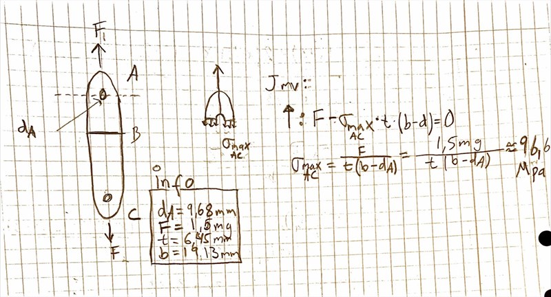 Innebär "spänningsberäkning över hålet" att det bara behövs en uträkning av hur stor kraft hålkanten tål? Alltså n*d*t*Ph=F som Niro skrev i inlägget du hänvisade till. För det som söks är "Spännings beräkning över hålet samt en bild över hur spänningsberäkningen ser ut över hålet". Är det hålet vid A som är stångens svagaste del då eller?
