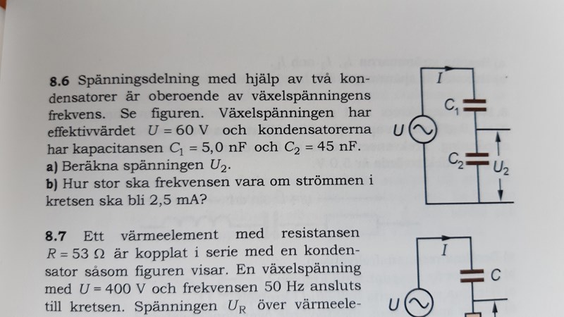 Jag vet ju att Spänningsfallet över C1 +U2 = 60V. Men jag vet inte hur jag ska beräkna spänningfallet över kondensatorerna. Jag antar att jag ska beräkna impedansen med formeln men blir osäker vad jag ska göra med när de säger att spänningsdelningen är oberoende av frekvensen.