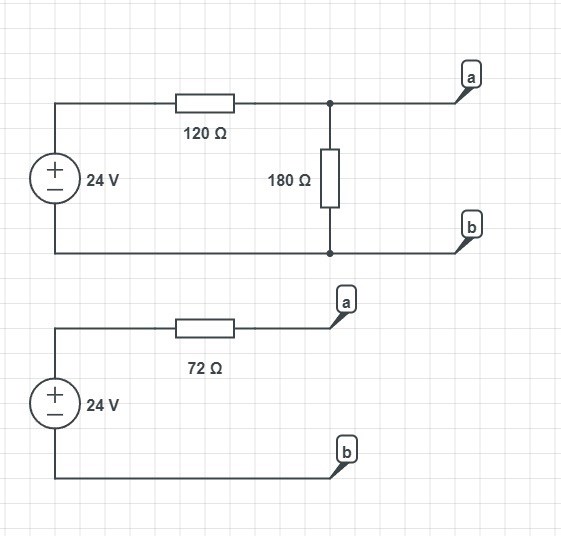 I den övre är polspänningen 180/(180 + 120)*24 = 14,4 V och kortslutningsströmmen 120/24 = 5 A