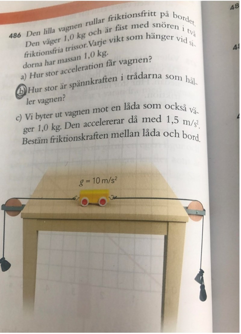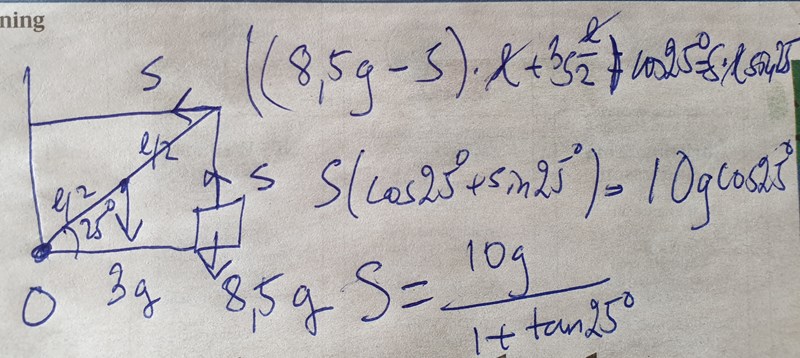 Jag har väldigt svårt när det kommer till spännkraftdr där jag inte kan avgöra var de verkar och var moment armen i detta fallet är är det någon som kan förtydliga eller ge några tips kring hur man ska tänka i t ex ovanstående uppgift. Jag vet att det finns 2 moment som verkar medurs. En tyngdkraft 8,5g och 3,5g där momentarmen är l och l/2. Min tanke är att jag behöver använda momentlagen för att bestämma kraften på wiren fast vart verkar den och hur stor är momentarmen