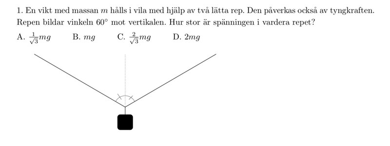 Prova att ändra vinklarna så ser du att kraften i repen ökar om linan sträcks och kraften sjunker om linan görs längre. Så det här var ett specialfall.