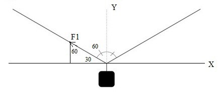 som du skriver. Det är lite svårt att se hur du tänkt, men vi drar en rak vågrät linje genom knutpunkten som vi definierar som x-axeln och en lodrät linje genom samma punkt som vi definierar som y-axeln. Vi definierar också F1 och F2 som krafterna i repen.