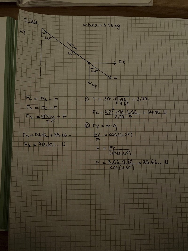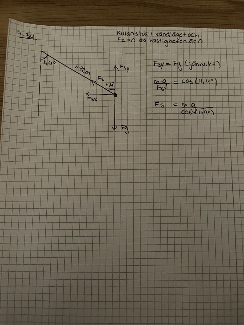 Hej! Jag har försökt lösa en uppgift som lyder: En trådpendel med längden 192 cm svänger så att största utslagsvinkeln är 11.4 grader. Utslaget kan betraktas som litet och pendelkulan väger 3,56 kg. Beräkna kraften i tråden när utslaget är maximalt. Ni ser min uträkning på bilden men förstår ej vad jag gjort för fel då facit säger 34 N. Tacksam för hjälp!