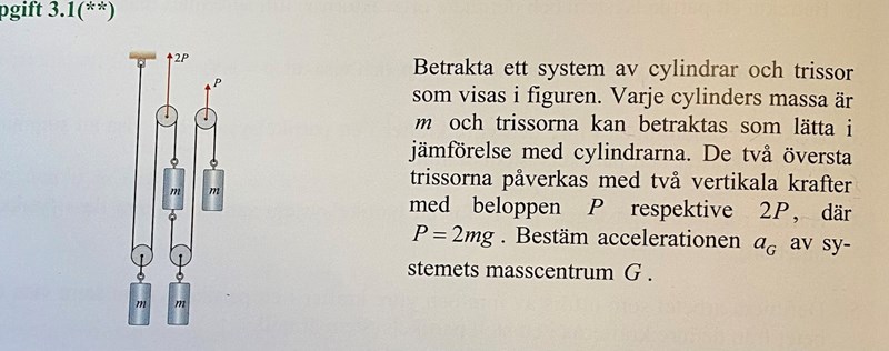 1. Hur vet man riktningen på spännkraften? Efter första trissan har spännkraften kvar sin riktning, dvs motsatt den i linan på andra sidan trissan. Men efter andra trissan har spännkraften fortfarande riktning neråt. Varför blir det så? Varför inte så som jag ritade ut med röda pilar?