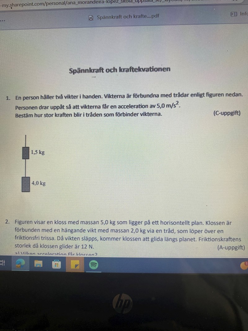 Uppgiften frågar om spänningen i snöret mellan vikterna.
