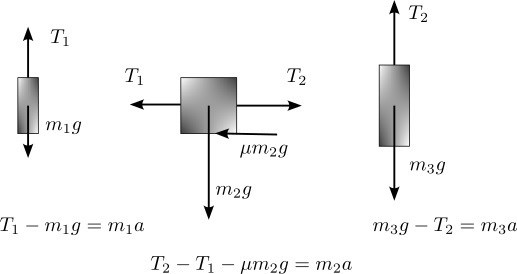Här ska man betrakta alla tre tyngder samtidigt. Alla tre har samma storlek på acceleration (eftersom trådarna inte ändrar längd).