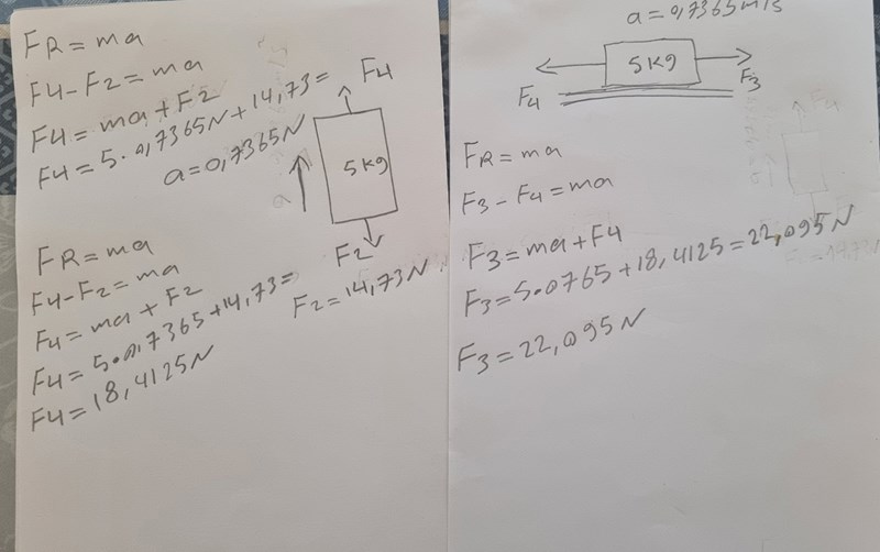 F2 - F3 = 14,73 - 12,273 = 2,457 N neråt och så vidare på den andra sidan vi har F1 = 34 N men den påverkar av två motstasa krafter nu F2 + Ff som ger F1= 34 - F2 - Ff = 34 - 2,273 - 12,273 = 19, 454 N.