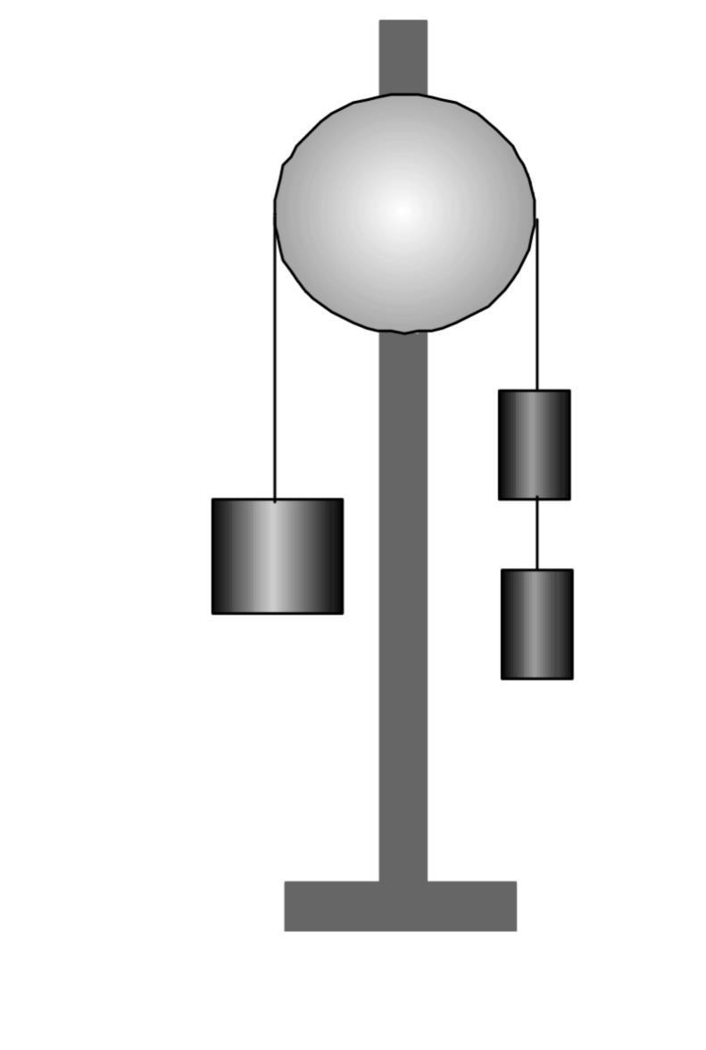 De båda lätta vikterna och den tunga vikten sitter ihop. Alla tre har samma acceleration, eller hur?