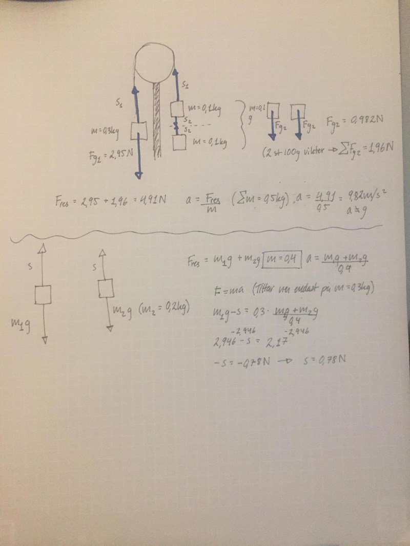 Jag fick fram svaret till 0,78N (i det långa snöret) vilket känns orimligt. Jag valde först att räkna ut accelerationen genom att summera båda ändars Fg till 4,91 N och sedan dividera det med systemets totala massa 300g+100g+100g=0,5kg men accelerationen blev då 9,82 vilket inte kan stämma. Jag anade att jag kanske inte borde ha inkluderat båda massorna till höger i och med att den långa tråden är mellan den högra sidans vikt och den ENA vikten till höger. Dock har jag fått fram ett svar som jag tvivlar på är korrekt.