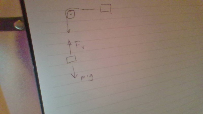 Jämvikt för vänstra massan Fv-mg=0 dvs Fv=mg