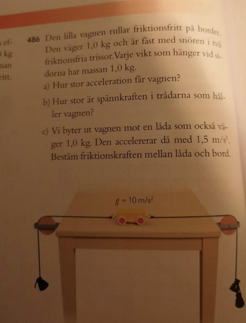 Hur blir det nu i c)-uppgiften då accelerationen för alla tre delarna har sjunkit till 1,5 m/s2. Hur stor är friktionskraften?