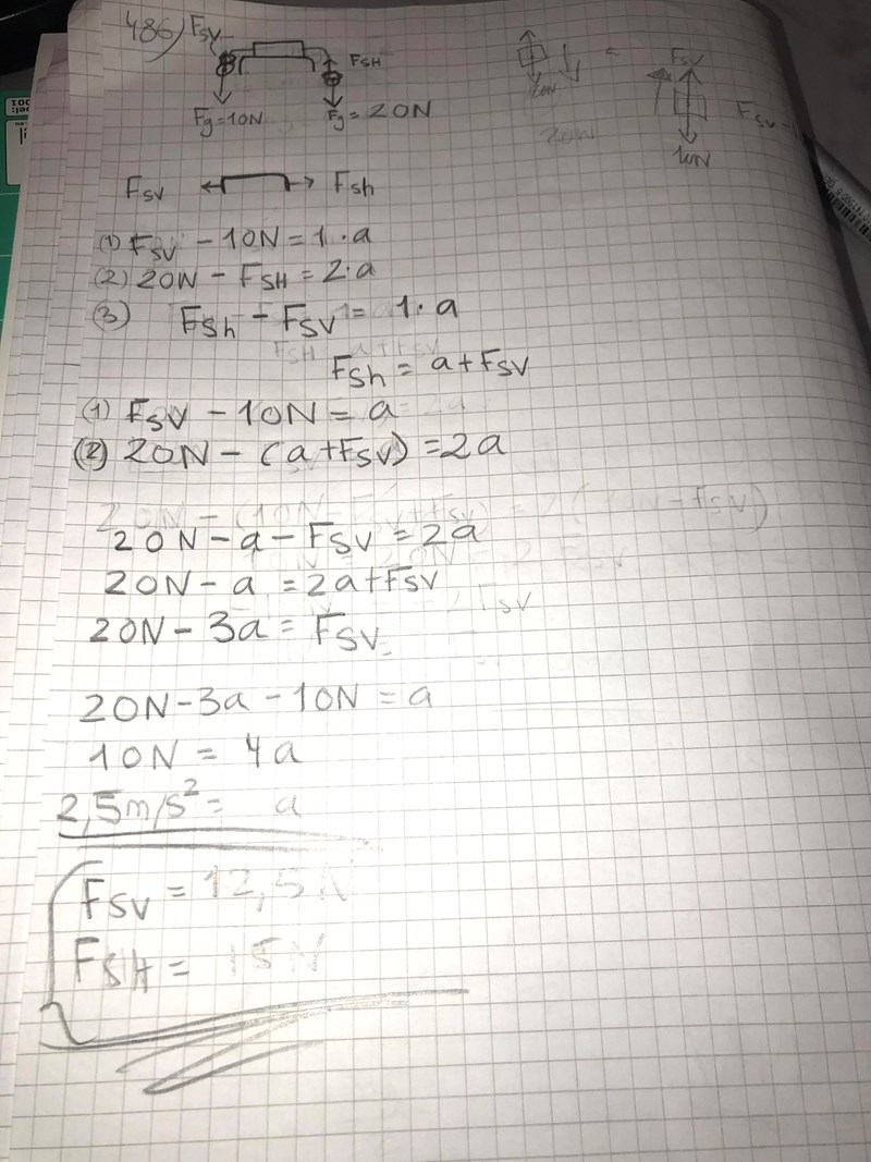 Ff=Fh-Fv-m*a = 17 -11,5-1*1,5 = 4 N