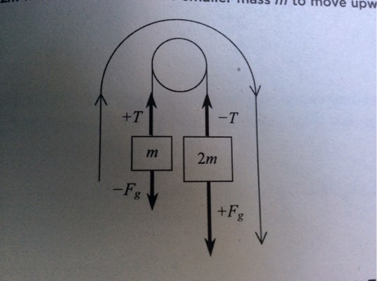 Hej! På bilden ser man tydligt ett accelererande system. Detta innebär ju att även repet måste accelerera. Men bilden visar trots detta två spännkrafter av motsvarande storlekar, vilket innebär att de båda vikterna drar ner i repet lika mycket (Newtons tredje lag). Detta skulle ju innebära att krafterna som påverkar repet tar ut varandra, så repet färdas i konstant hastighet.