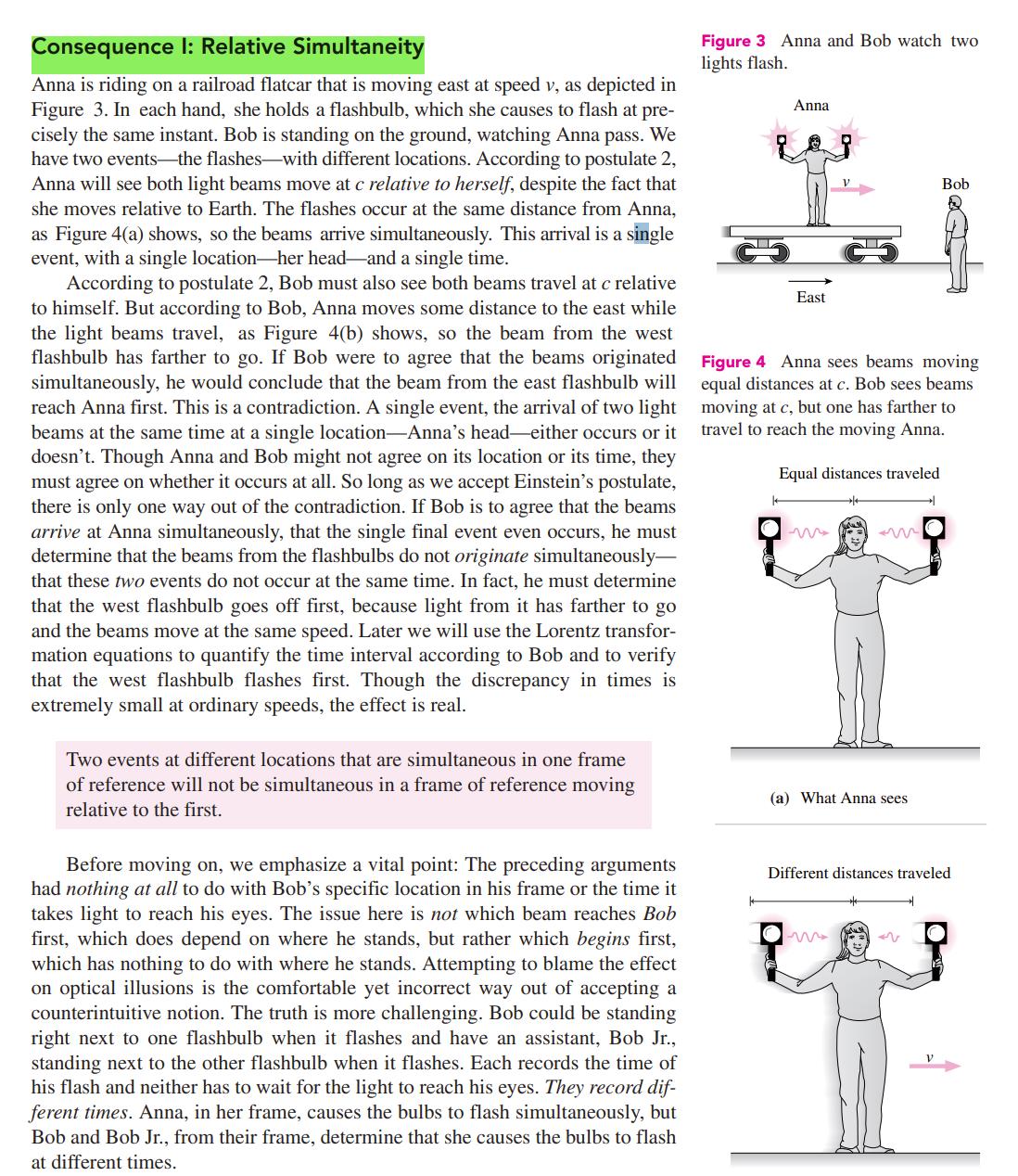 Men ett annat sätt att lösa motsägelsen är väl att Bob då INTE medger att ljuset träffade Anna samtidigt? För mig låter det mindre ointuitivt än att Bob påstår att Anna inte har tryckt igång lamporna samtidigt.
