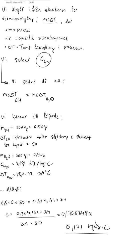 Jag har fått ut följande uträkning, men är osäker om jag gjort rätt vid temperaturskillnaden på koppar. Någon som vet?