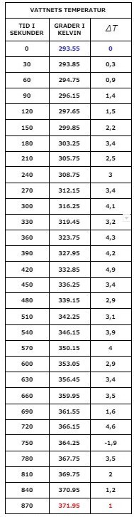 ΔT=(Temperatur då vattnet kokade-Temperatur innan uppvärmning)K
