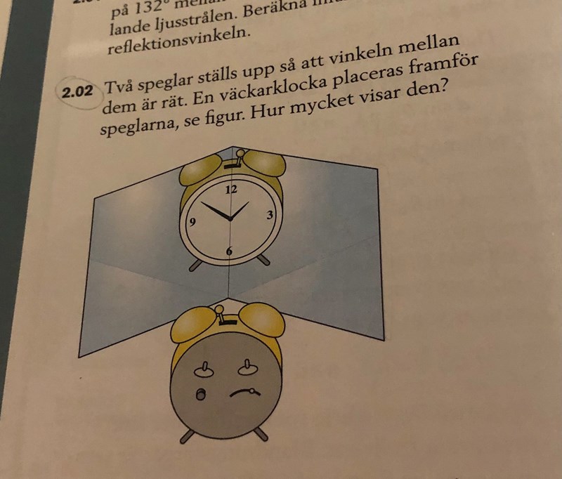 Ingen stråle går igenom någon spegel, det är 2 vanlig speglar placerade vinkelrätt mot varandra. Tänk efter var t ex 9:a sitter på urtavlan på klockan. Rita en bild uppifrån. Om en stråle går rakt från urtavlan mot ena spegeln, hur studsar den? Rita ut strålen så du ser var den tar vägen. Gör samma sak med 3:an.