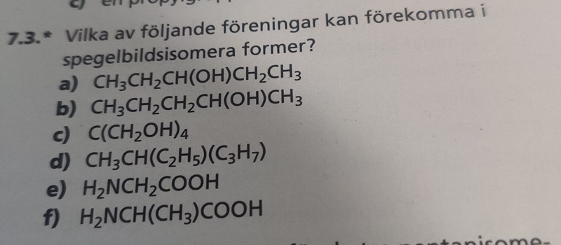 Det enklaste är att rita upp varje molekyl och därefter kolla om det finns något kiralt kol. Det går att göra det direkt från formeln, men det är betydligt svårare.