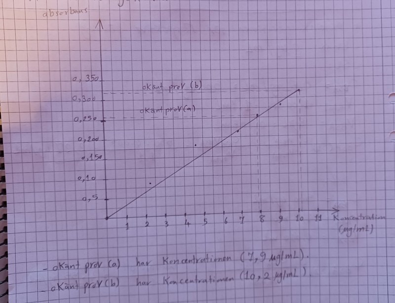 Det okända provet (a) har absorbansen 0.252 => det har koncentration 7.9 mikrogram/ml