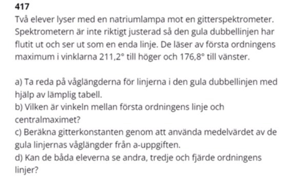 Sedan är det detta med dessa gammalmodiga spektrometrar med en cirkelskala. Om man inte har gjort något experiment med dem är sådana uppgifter svåra. Man borde skrota sådant, tycker jag.