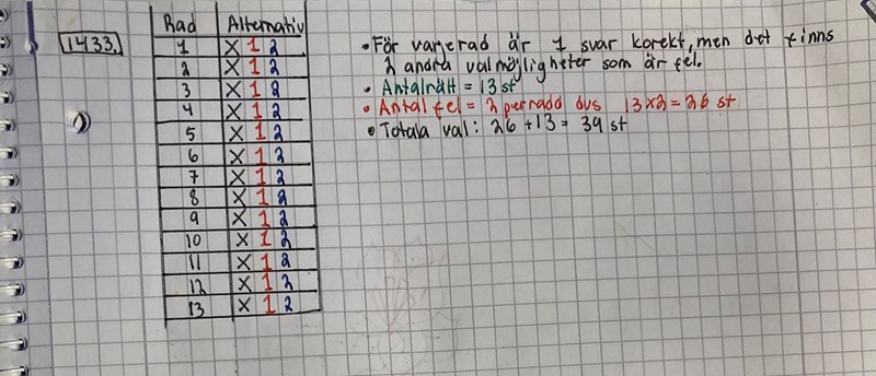 Jag tror jag lyckades lösa den. Gjorde en till exempel uppgift, (se bild) men det känns ju lite märkligt att man skulle behöva satsa fler rader för att får färre rätt😂