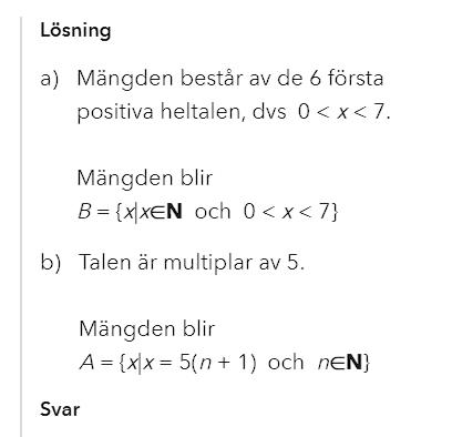 På a)-uppgiften har jag svårt att se att det skulle spela någon roll. På b)-uppgiften så så beskriver de ju först x som beroende av variabeln n innan de definierar vilka n det gäller, så det skulle bli en smula oklart att säga "x sådana att n är naturligt och x är 5*(n+1)". Jag tror dock inte att någon mattelärare skulle sätta fel med omvänd ordning.
