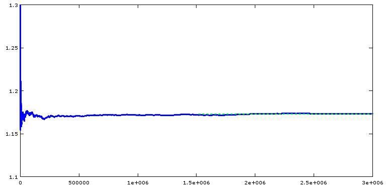 Figuren nedan visar kvoten av försvararens förlorade armeér och anfallarens förlorade armeér som funktion av antalet strider, här upp till 3 miljoner. Kvoten verkar plana ut vid 1.173.