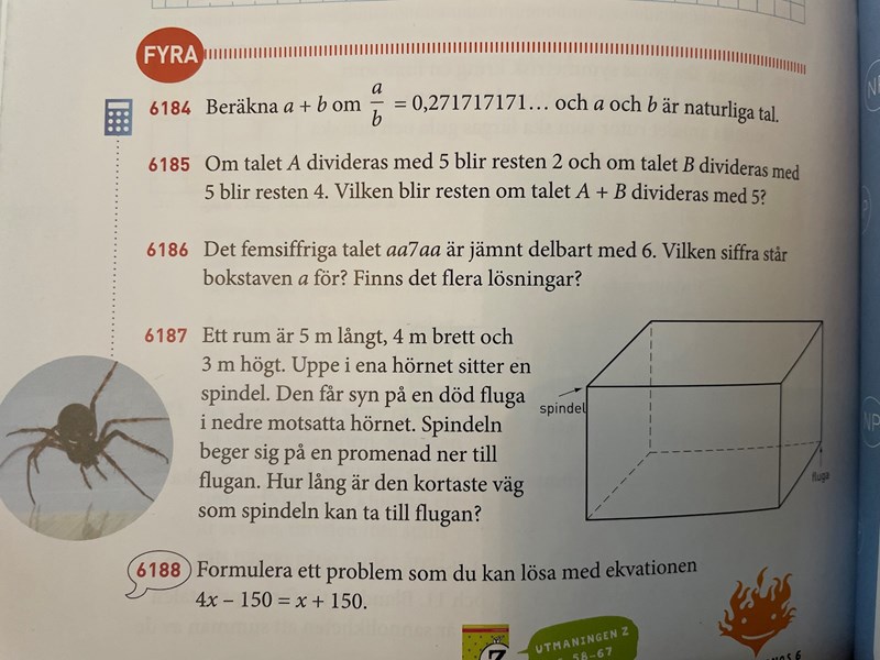 Frågan lyder som följande: Ett rum är 5 m långt, 4 m brett och 3 m högt. Uppe i ena hörnet sitter en spindel. Den får syn på en död fluga i nedre motsatt hörnet. Spindeln beger sig på en promenad ner till flugan. Hur “lång” är den kortaste väg som spindeln kan ta till flugan?