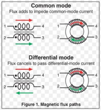 Det där fenomenet med samverkande och motverkande flöden i spolar utnyttjar man i vissa elektroniska komponenter. Det du ska se till är att välja de kopplingsalternativ som ger "common-mode current"