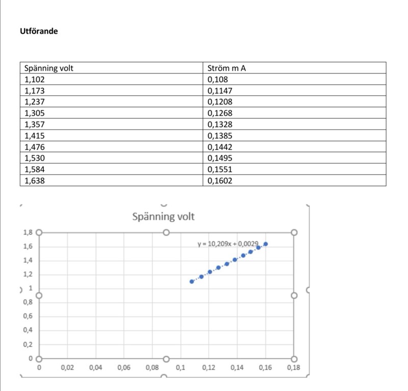 Uppgiften här var att jag skulle undersöka hur den elektriska spänningen över spolen varierar med strömmen genom spolen och detta gjorde jag på en lab. Sen så skulle jag svara på två frågor, först skulle jag få fram riktningskoefficenten och det fick jag fram genom Excell när jag la in mina värden sen så andra frågan ser ut så här: Bestäm koppartrådens längd i spolen med hjälp av riktningskoefficenten, och jag vet inte riktigt hur